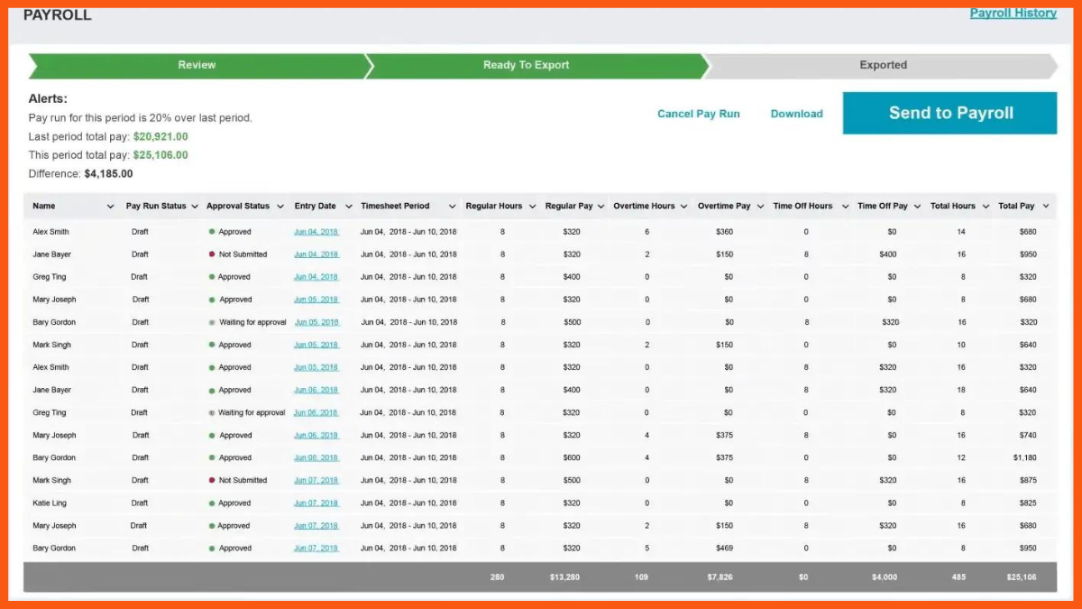 Para o processamento da folha de pagamento, o Patriot requer apenas três etapas que são tão simples quanto parecem. Tudo o que você precisa fazer é inserir as horas do funcionário por meio do software de atendimento e horário do Patriot, após o qual você deve aprovar a folha de pagamento com um clique e imprimir o contracheque, recibos ou ambos, conforme sua necessidade.