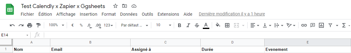 Você deve criar uma planilha do Google Sheets com as diferentes colunas correspondentes aos títulos do seu evento. No Calendly, você preencheu o nome do seu evento e dentro de: