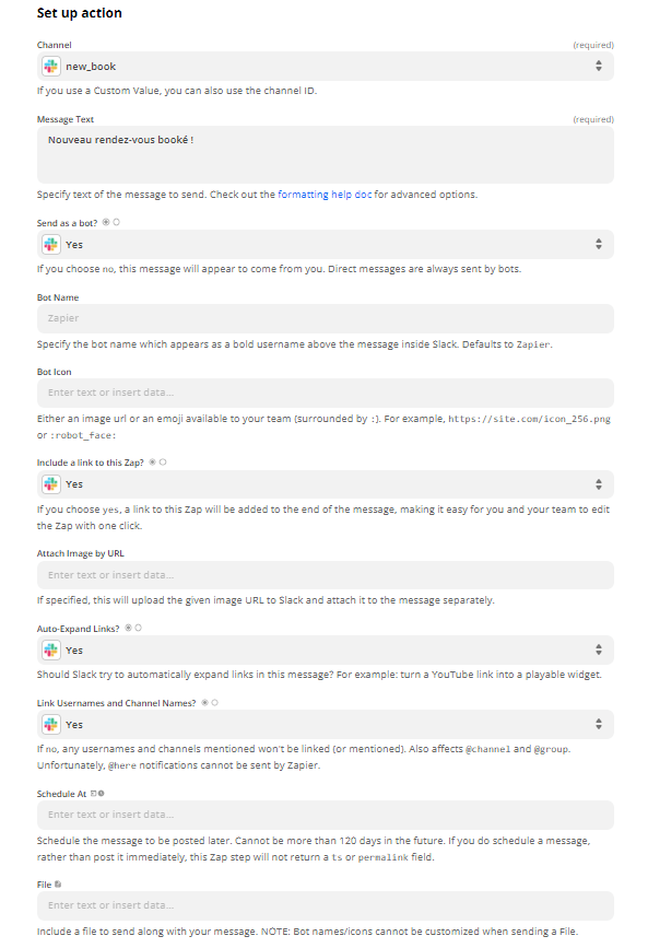 - Na Ação Configurar escolha o canal em que a mensagem deve ser enviada, a mensagem a enviar e os vários outros campos de acordo com o que você deseja,