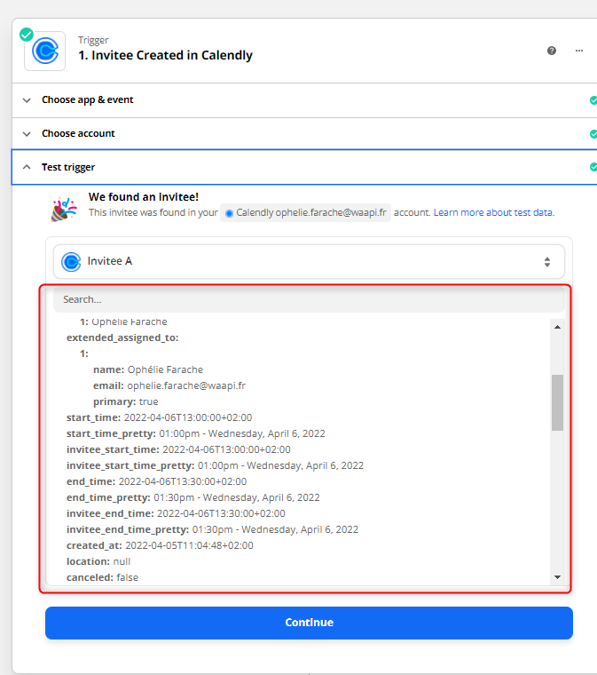 Você pode adicionar informações ao seu Zap. Todas as informações que podem ser sincronizadas estão listadas para você na “Ação de Teste” no Zap “Calendly”.