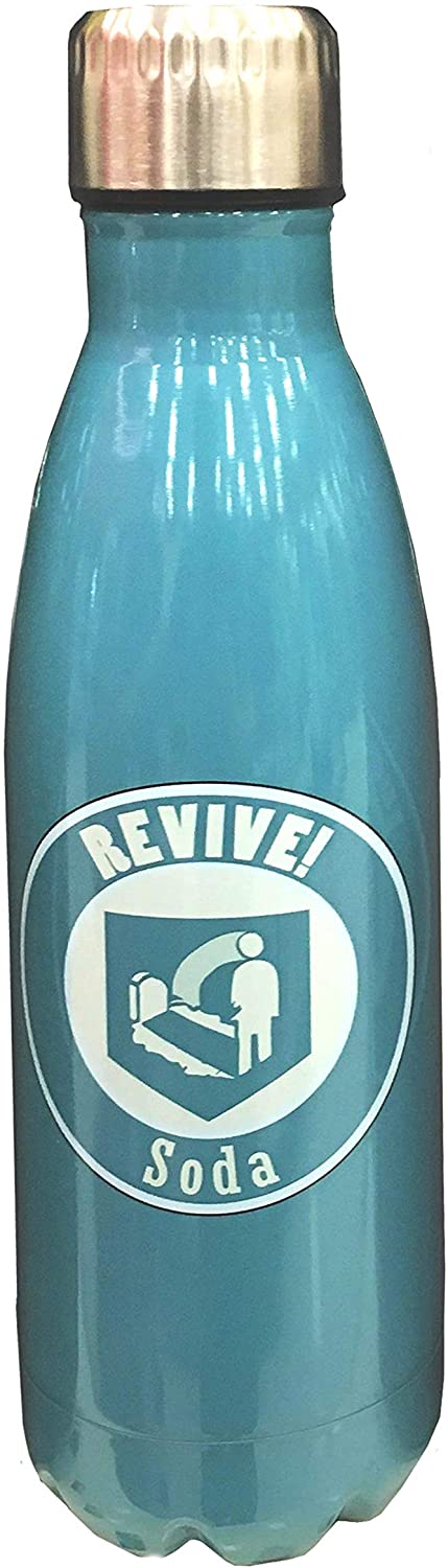 Esta garrafa de água Call of Duty Perks vem na cor azul metálica com um parafuso prateado na parte superior de metal. É uma garrafa de água sem BPA que imita o sabor de peixe reviver.