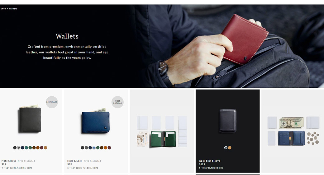 Não é incomum ver uma imagem em movimento apresentando o produto. Na verdade, o exemplo acima de Bellroy mostra um vídeo em sua galeria.