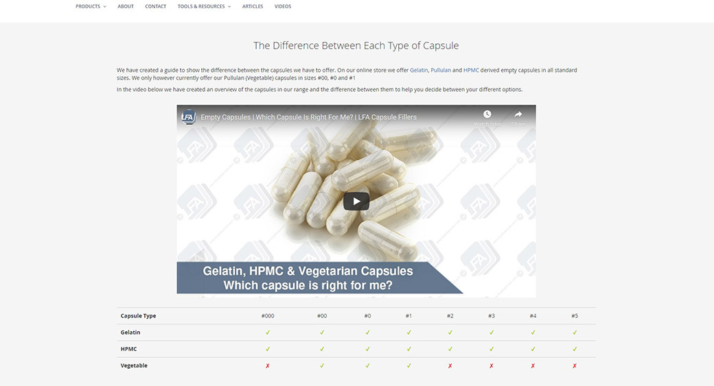LFA Capsule Fillers nos mostra como agregar valor excepcional ao conteúdo de vídeo em sua página de produto “Cápsulas vazias”. Eles não apenas destacam as diferentes opções disponíveis para o cliente; em vez disso, eles se aprofundam nos aspectos técnicos da produção e dos aplicativos.