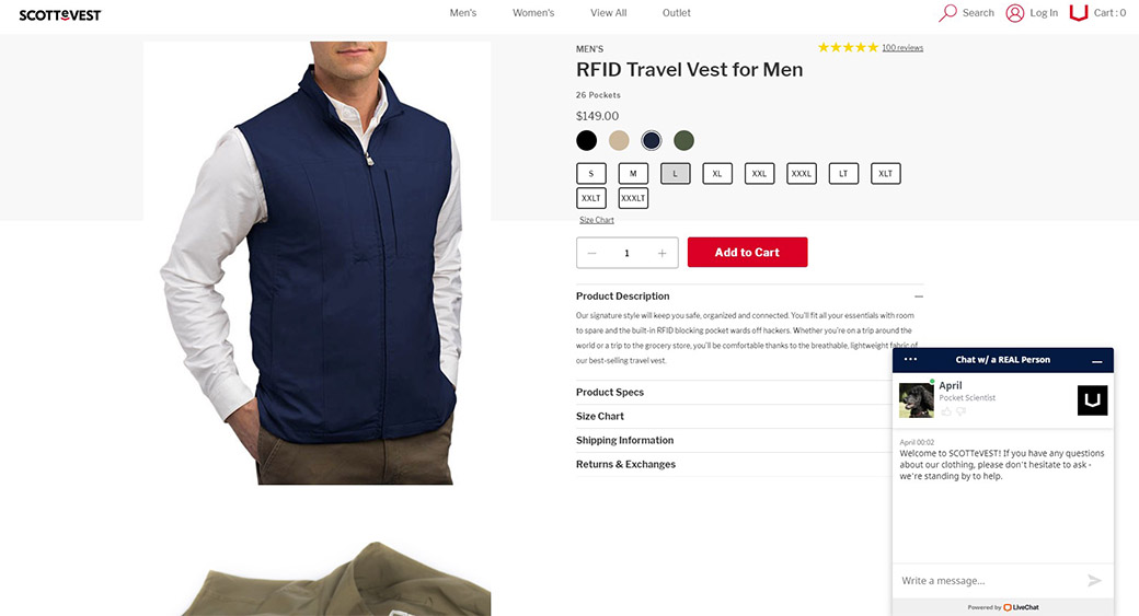 Podemos ver um ótimo exemplo de um site que fez isso com elegância e sucesso no Scottevest . Essa empresa de roupas de viagem não apenas atende às dúvidas dos clientes com bate-papo ao vivo, mas também chega de forma proativa aos visitantes do site, perguntando se eles podem ajudar.