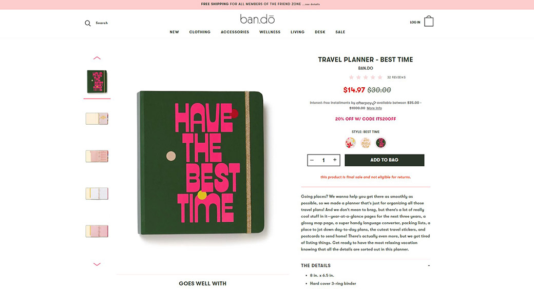 Ban.do é um excelente exemplo de página de produto que descreve seus produtos de forma criativa, sem comprometer os detalhes. A descrição de cada produto é relativamente intensiva em texto - geralmente cerca de 100 palavras. Mas o tom é divertido e o conteúdo significativo - em resumo, há um equilíbrio perfeito entre ser informativo e envolvente.
