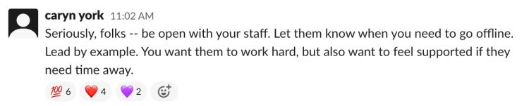 Ao longo dos quatro dias, ouvimos muitos palestrantes compartilharem expressões idiomáticas sobre como você deve primeiro colocar sua própria máscara de oxigênio, encher seu próprio copo e cuidar de si mesmo para realmente liderar pelo exemplo. A captura de tela abaixo é de Caryn York, CEO da Job Opportunities Task Force, durante uma conversa no Slack após sua sessão, Pandemics and Revolutions: Now Is Not the Time to Play It Safe.
