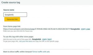 A Amazon agora oferece a opção de criar tags de origem de vitrine personalizadas para rastrear as vendas e o tráfego resultantes. Esta é realmente uma ótima maneira de rastrear o ROI do tráfego externo. Para criar uma tag de origem, visite Storefront -> Manage Stores -> View Insights. Esta página fornece uma visão geral do tráfego, vendas, análise de página e fontes. Crie uma tag em Sources -> Create Source Tag.