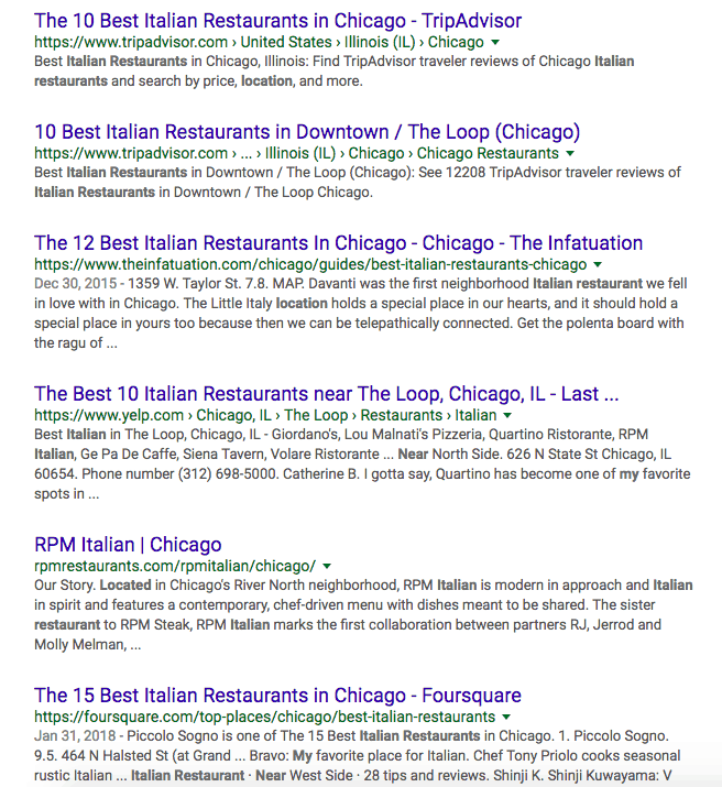 Você pode começar realizando uma pesquisa “perto de mim” que corresponda ao assunto do seu negócio. Por exemplo, os principais resultados exibidos para uma pesquisa “restaurante italiano perto de mim” no Google são de sites como Tripadvisor, Yelp e Foursquare.