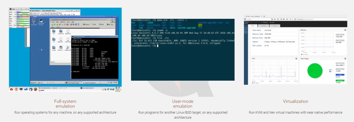 O QEMU oferece emulação de modo de usuário onde você pode executar programas para outro destino BSD/Linux em qualquer arquitetura. Obtenha o mesmo desempenho ao executar máquinas virtuais Xen e KVM. Ao usar uma máquina KVM, o QEMU pode virtualizar servidor, PowerPC incorporado, x86, ARM de 64 bits e ARM de 32 bits, POWER de 64 bits, convidados MIPS e S390.
