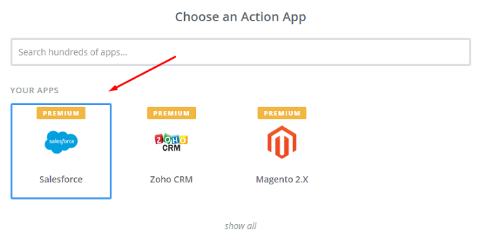 • Primeiro, você escolhe Salesforce na página Escolher um aplicativo de ação .