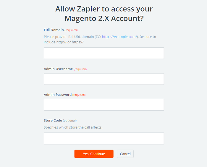 • Em seguida, você permitirá que o Zapier acesse sua conta Magento preenchendo os campos conforme a imagem abaixo, incluindo Domínio Completo, Nome de Usuário Admin e Senha Admin. Depois disso, clique no botão Sim, continuar .