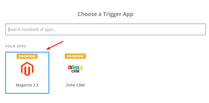 • Agora você vê a página Choose a Trigger App , escolha Magento 2.x para prosseguir com a integração.