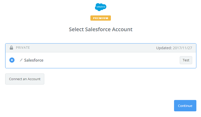 • Assim como se conecta a uma conta Magento, você seleciona uma conta Salesforce, clica em Conectar uma conta e segue as instruções.