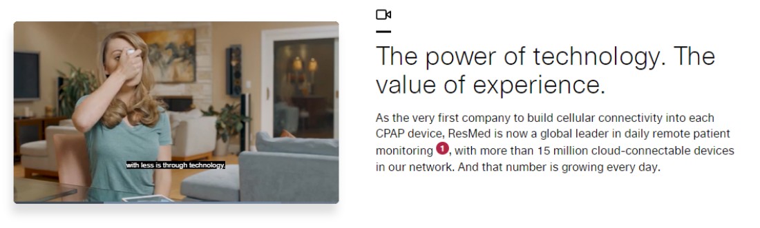 A ResMed é uma das líderes globais em monitoramento remoto de pacientes. Possui conectividade celular em todos os dispositivos CPAP com mais de 15 milhões de dispositivos em nuvem e define a conexão entre melhor saúde e tecnologia. A plataforma pode coletar facilmente dados do paciente para melhorar os resultados e reduzir os custos de assistência médica. Está crescendo diariamente a partir dos resultados e feedback e permite a integração com outros sistemas além da rede da ResMed.