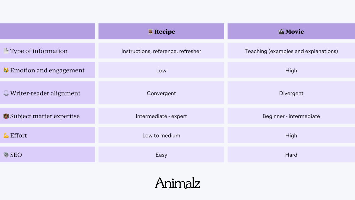 Se tudo o que o Google oferece são receitas com poucas alterações nessa classificação ao longo do tempo, pode não haver uma oportunidade para conteúdo no estilo de filme. Quando você vê outras peças narrativas bem classificadas ou precisa de uma maneira de se destacar, escrever uma história pode valer a pena.