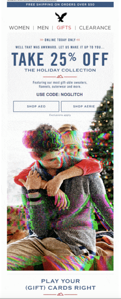 Em certos cenários, a diversão pode ser aproveitada para suavizar problemas técnicos que causaram uma experiência negativa do assinante. A American Eagle injeta alguma leviandade em seu e-mail oops com uma linha de assunto espirituosa e um pré-cabeçalho que funciona para estabelecer um problema no site (Oops! Nosso site teve alguns problemas). O e-mail está cheio de joias de desculpas. Os assinantes recebem um incentivo de 25% de desconto e um código promocional referenciando a falha do site (NOGLITCH). O American Eagle ainda incorpora um GIF relevante e envolvente que ilustra de forma hilária o erro original. Entre a oferta compensatória e o humor, a American Eagle aproveita um erro de e-mail para agradar seus assinantes.