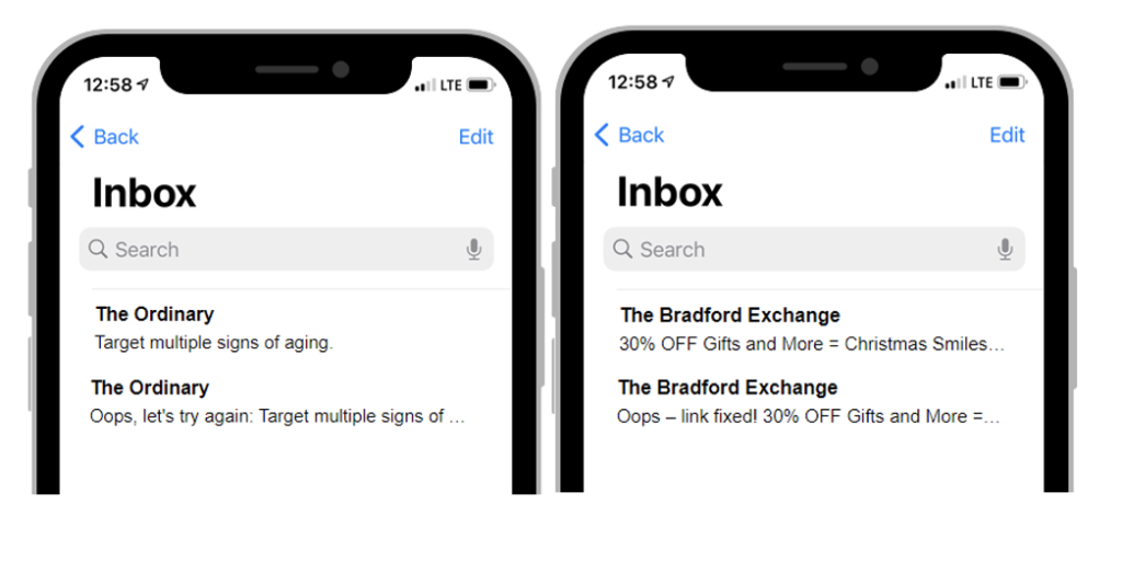 Considere estas linhas de assunto do The Ordinary e do The Bradford Exchange. Nenhuma das marcas alterou o conteúdo do e-mail original, mas ambas identificaram um oops na linha de assunto. Há uma diferença fundamental: o Bradford Exchange registra explicitamente um problema de link na versão anterior, enquanto o The Ordinary não especifica o erro original.