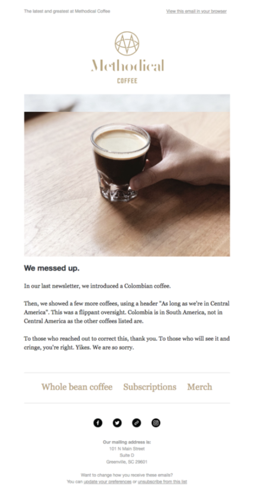 A Methodical Coffee aproveitou o canal de e-mail para emitir uma retratação e ajudar a reconstruir a confiança com sua base de assinantes. Eles aproveitam esta oportunidade para abordar o sentimento negativo do assinante diretamente, reconhecendo o erro como digno de vergonha, pedindo desculpas e validando os sentimentos do assinante. Como no exemplo de Framebridge, o tom do e-mail de desculpas parece sincero porque eles não incluíram nenhum material promocional.