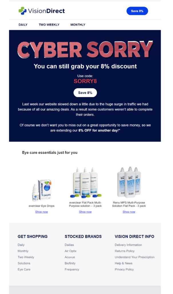 Uma extensão de venda é emocionante - seja parte de um pedido de desculpas ou não. Depois que um aumento no tráfego causou problemas no site, a VisionDirect fez as pazes com seu público, dando aos assinantes potencialmente frustrados mais um dia para aproveitar uma venda crítica. Ao confirmar quais assinantes não conseguiram concluir suas compras, esta campanha é hiper-segmentada. Como um bônus adicional, eles conseguiram dobrar uma venda cibernética em sua linha de assunto oops e copiar de maneira inteligente e criativa.