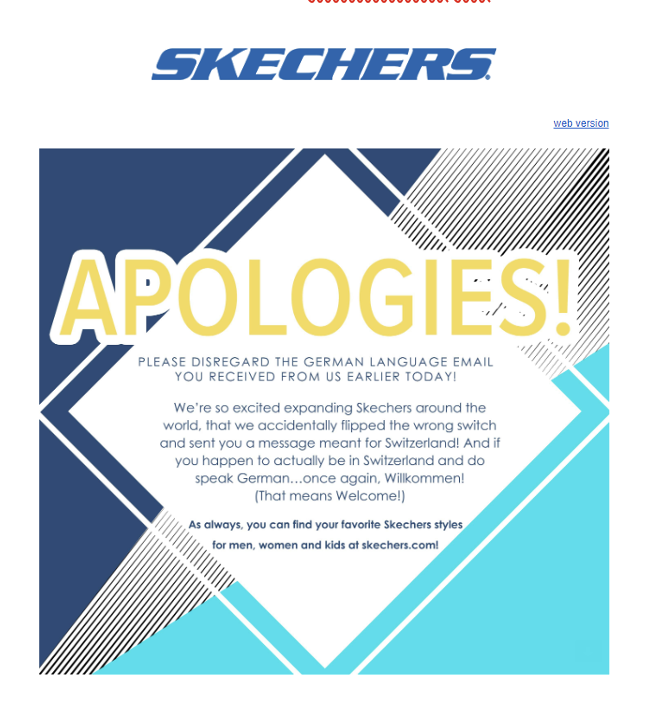 Wieviele Sprachen sprechen Sie? Presumivelmente, a esperança mais básica de um profissional de marketing é que seu público possa realmente ler o conteúdo de um e-mail. O público falante de inglês da Skechers deve ter ficado pelo menos um pouco confuso ao receber um e-mail em alemão, que foi imediatamente seguido por um pedido de desculpas.