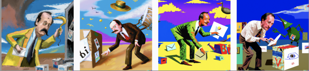 O gerador de imagens DALL-E 2 da OpenAI responde a solicitações complexas em segundos . Por exemplo, pedi ao gerador uma imagem de Tim Berners-Lee (o inventor da World Wide Web) procurando perplexo seus e-mails perdidos, pintados no estilo de Salvador Dali.