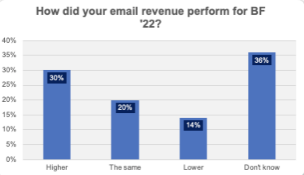 Apesar das preocupações válidas de que a crise econômica tornará os consumidores menos propensos a clicar e comprar, a receita de e-mail continua forte. Perguntamos aos participantes do webinar State of Email Live sobre o desempenho de seus emails na Black Friday até a Cyber Monday 2022. Surpreendentemente, os que relataram crescimento superaram os que relataram receitas menores em dois para um .