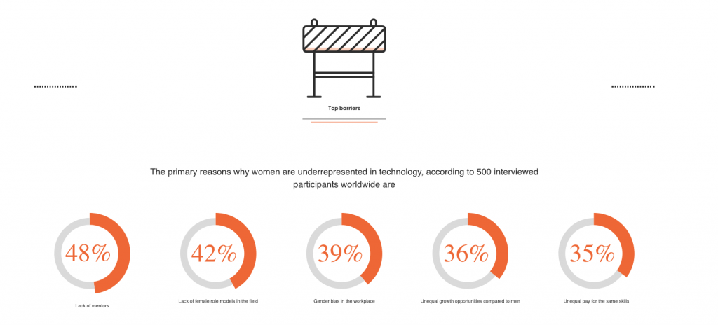 BARREIRAS NA REPRESENTAÇÃO DE MULHERES NA TECNOLOGIA. As principais razões para a sub-representação das mulheres apontam para o preconceito de gênero e a disparidade entre as oportunidades, remuneração e modelos para as mulheres na indústria versus os dos homens. Dados e imagem da Adeva.