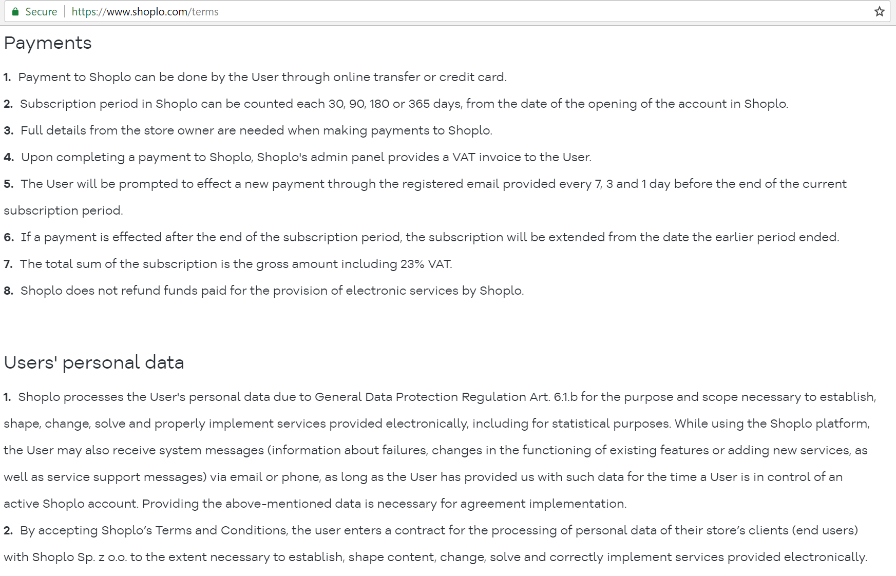 A última seção a ser discutida em nosso modelo de página Sobre nós são os termos da sua loja. Embora seja uma ideia inteligente ter uma página específica que discuta todos os seus termos, provavelmente também vale a pena mencionar nesta página.