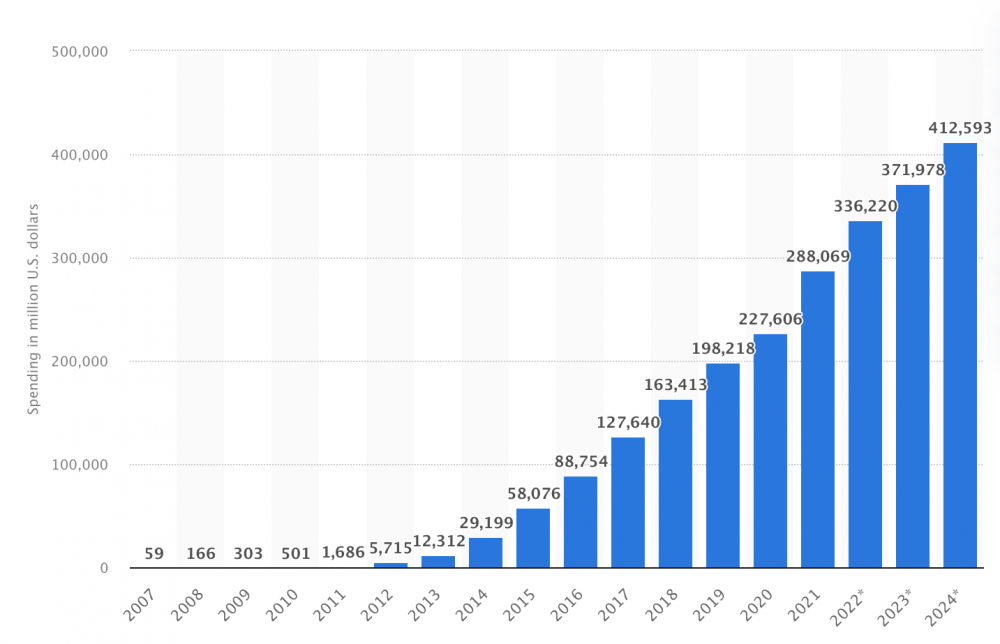 Cheltuielile de publicitate mobilă la nivel mondial între 2007 și 2024 (în milioane de dolari SUA), Statista