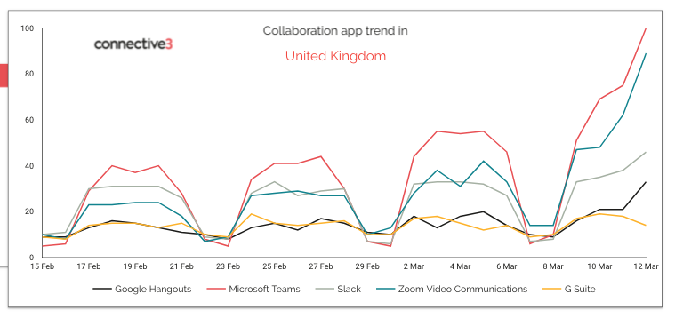 Un al treilea factor care devine din ce în ce mai evident este că oamenii își schimbă comportamentul și obiceiurile ca răspuns la provocările actuale. Oamenii lucrează acum mai mult de acasă – și folosesc instrumente de colaborare precum Microsoft Teams, Zoom și Slack într-o măsură mult mai mare, așa cum demonstrează următoarea postare de la Publisher Discovery: