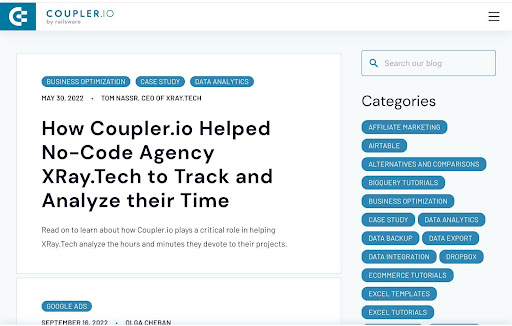 Aici puteți lua referință de la acest sistem de gestionare a datelor – Cupler. Marca a folosit etichete relevante pentru a organiza secțiunea de blog, cum ar fi integrarea Excel, exporturile de date etc.
