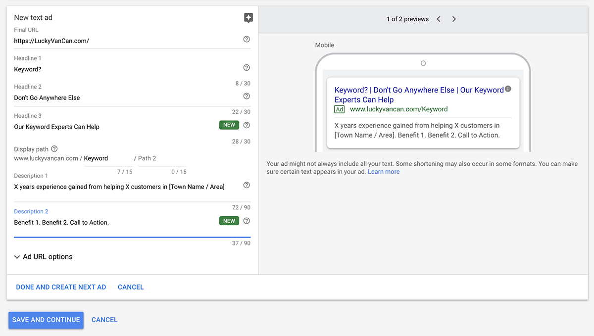 Adresa URL a căii de afișare/[Cuvânt cheie] Descriere 1: [X] ani de experiență dobândiți în ajutorul [X] clienți din [Numele orașului/Zona] Descrierea 2: [Beneficiul 1]. [Beneficiul 2]. [Apel la acțiune].