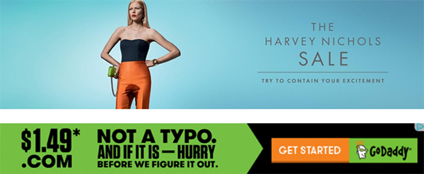Un alt exemplu de la Erin a fost crearea de reclame care să-i facă pe cei care caută să râdă. În exemplele de mai jos, Harvey Nichols și GoDaddy au folosit umorul în reclamele lor pentru a atrage atenția și a vă convinge să dați clic.