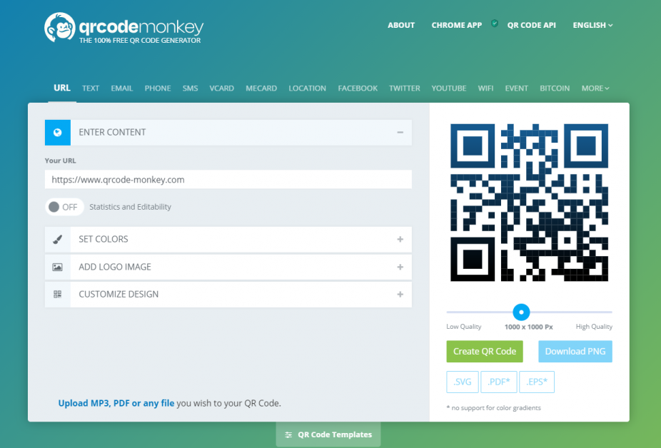 Urmând o tendință similară cu QR Code Tiger, QR Code Monkey vine cu o mulțime de tipuri QR și opțiuni de personalizare, dar salvează unele dintre caracteristicile sale de top pentru programul plătit. Platforma oferă funcția de a descărca QR-ul în format SVG, PDF sau EPS. Vă rugăm să rețineți că formatul EPS este perfect dacă intenționați să vă imprimați codurile pe marfă, dar EPS nu acceptă degrade de culoare.
