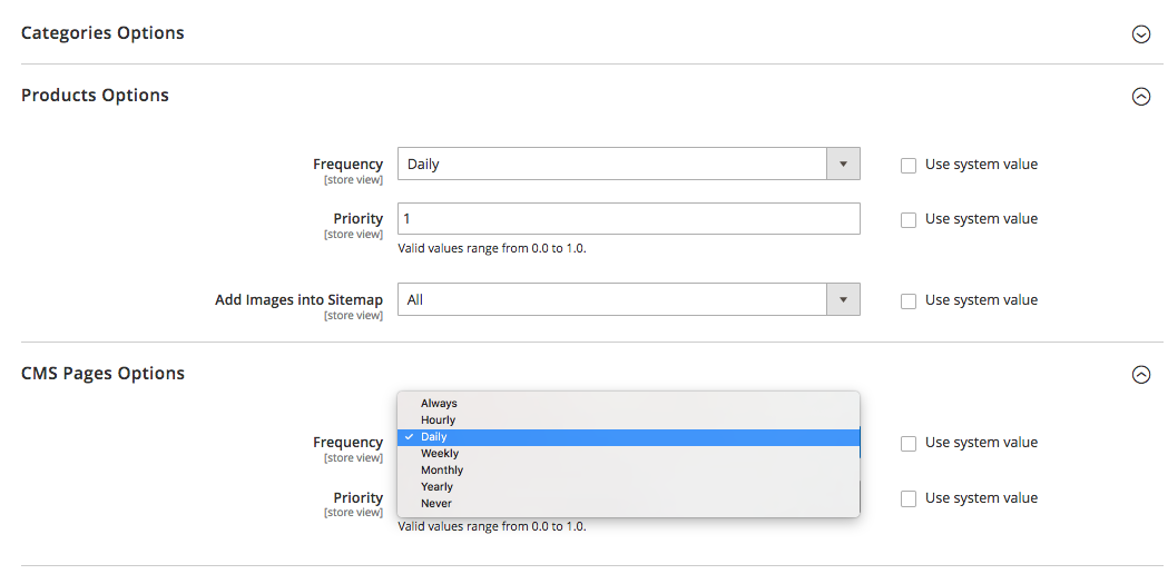 De exemplu, în Magento 2, puteți periodic periodicitatea ciclurilor de actualizare a sitemapului. Când îl definiți în setările de configurare ale platformei, semnalați crawler-ului că paginile site-ului dvs. sunt actualizate la un anumit interval de timp (o dată, săptămânal, lunar), iar site-ul dvs. are nevoie de o altă accesare cu crawlere.