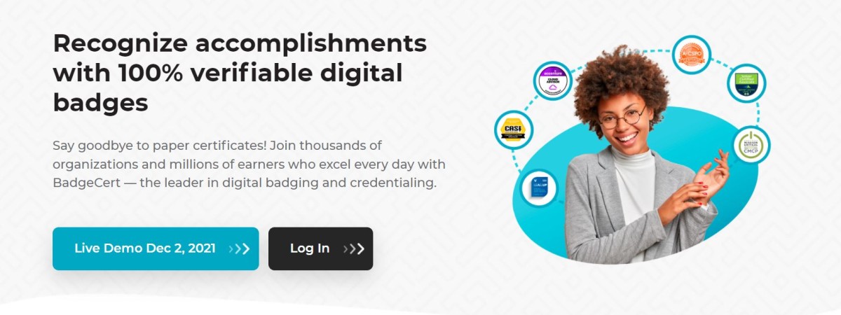 În plus, API-ul BadgeCert vă ajută să vă integrați cu platformele CRM și LMS. Beneficiarii vor beneficia de un portofoliu bazat pe cloud și de capacitatea de a-și împărtăși realizările pe bazele de date ale angajatorilor, site-uri de carieră, CV-uri online, semnături de e-mail și rețele sociale. În plus, BadgeCert deservește multe industrii, inclusiv asociații, furnizori de formare, universități, corporații, organizații non-profit etc.