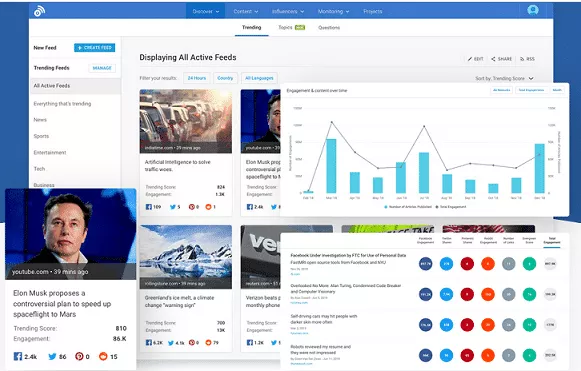 Această platformă de cercetare a conținutului oferă informații pentru a vă ajuta să creșteți implicarea clienților, oferind conținutul potrivit la momentul potrivit. De asemenea, conectează companiile cu cei mai influenți și măsoară performanța prin analize și mențiuni sociale.