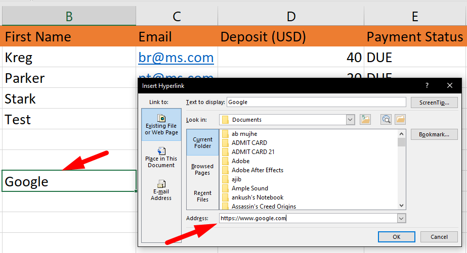 Inserați un hyperlink folosind Ctrl + K