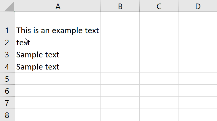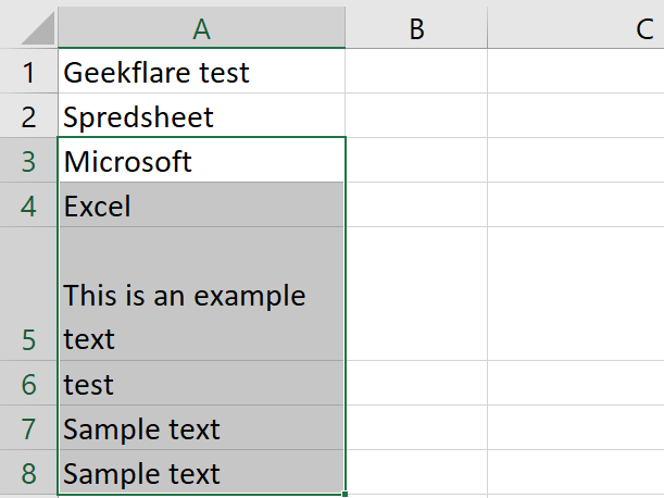Cu toate acestea, atunci când vine vorba de scrierea unui text mai lung decât lungimea celulei, ar putea părea confuz. Chiar dacă textul rămâne în aceeași celulă, pare să se îmbine cu alte rânduri, așa cum se arată în imaginea de mai sus.