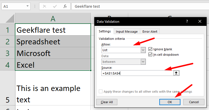 După aceasta, tot ce trebuie să faceți este să selectați celula în care doriți lista drop-down și să alegeți celulele sursă. După ce ați terminat, trebuie să navigați către „ Validarea datelor” din meniul „ Date ” și să îl schimbați în „ Lista ”, în timp ce specificați sursele.