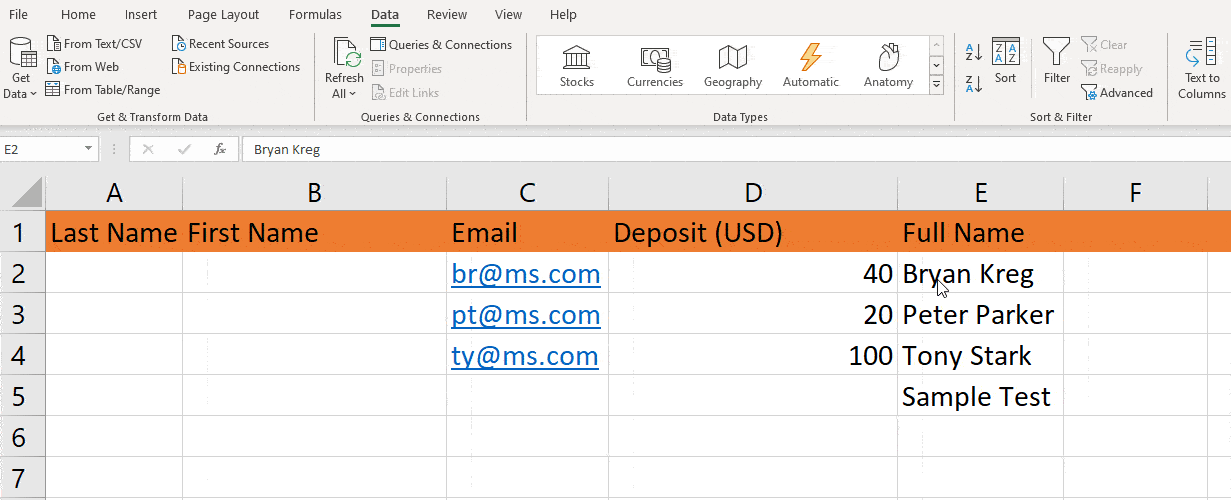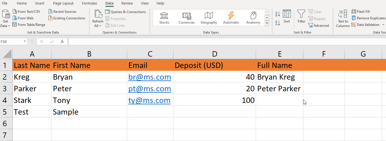 În mod similar, să presupunem că aveți două câmpuri, „Prenumele” și „Numele”, dar doriți o altă coloană pentru numele complet, Flash Fill vă va fi util aici.