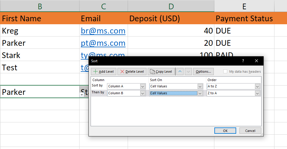 Când lucrați cu mai multe coloane, puteți utiliza comanda rapidă ALT + A + S + S pentru a deschide caseta de dialog în care puteți specifica mai multe coloane de sortat.