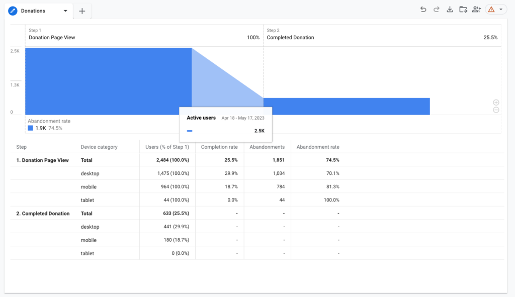 - Selectați APLICAȚI pentru a vedea raportul final al canalului de donație. Ajustați intervalul de timp după cum este necesar și personalizați tabelul de sub grafic folosind secțiunea Defalcare pentru o vizualizare mai detaliată a completărilor și abandonurilor.
