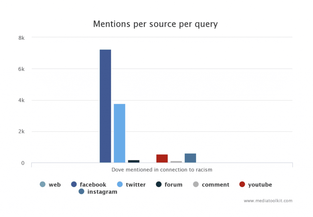 În plus, puteți utiliza aceste informații pentru o prezentare mai precisă a mențiunilor dvs. pe o perioadă de timp și pe diferite canale. Când am analizat criza lui Dove, am luat notă de câte ori Dove a fost menționat în legătură cu rasismul: