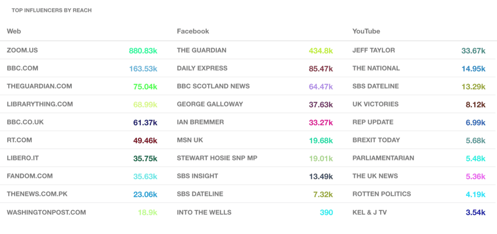 Mediatoolkit este un instrument uimitor de monitorizare a rețelelor sociale, cu un tablou de bord ușor de utilizat, care vă permite să aflați viitorii susținători ai mărcii. Veți găsi o secțiune dedicată în care puteți sorta cu ușurință numărul de mențiuni, sursă, acoperire și sentiment. Puteți găsi influențatorii potriviți pentru marca dvs. căutând conținutul acestora și folosindu-i în avantajul dvs.
