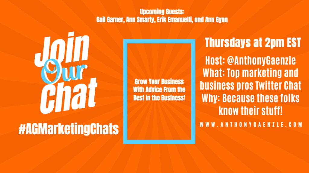 Pentru a fi la curent cu când va avea loc fiecare chat și pentru a afla despre viitorii oaspeți, urmăriți-mă pe Twitter (@AnthonyGaenzle) și urmăriți hashtag-ul #AGMarketingChats. Chaturile vor acoperi subiecte precum: