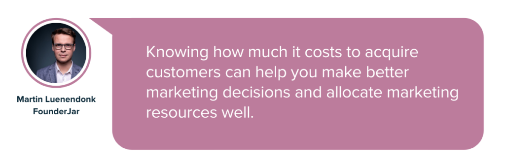 Martin Luenendonk, CEO la FounderJar, este de acord: „Această măsurătoare vă permite să cunoașteți costul total al câștigării unui nou client. A ști cât costă achiziționarea de clienți te poate ajuta să iei decizii de marketing mai bune și să aloci bine resursele de marketing.”