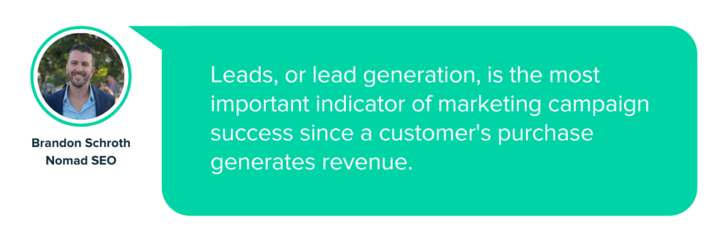 „ Lead-urile, sau generarea de lead-uri, este cel mai important indicator al succesului campaniei de marketing, deoarece achiziția unui client generează venituri. Acest lucru este urmărit prin trimiterea formularelor de contact, apeluri telefonice și solicitări de programare”, spune Brandon Schroth, co-fondator la Nomad SEO.