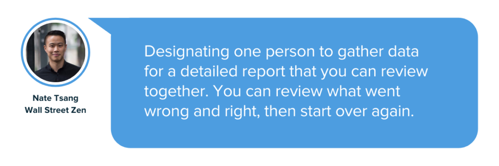 Fondatorul și CEO-ul Wall Street Zen, Nate Tsang, sugerează: „Desemnarea unei persoane care să culeagă date pentru un raport detaliat pe care îl puteți examina împreună.”