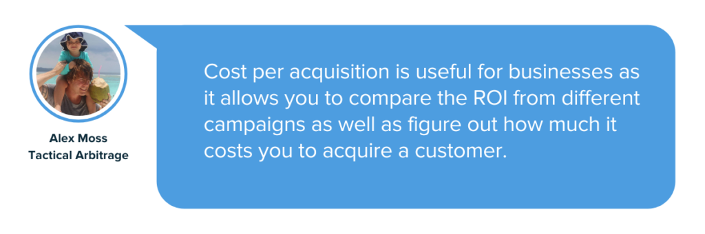 „Costul pe achiziție este util pentru companii, deoarece vă permite să comparați rentabilitatea investiției din diferite campanii și să vă dați seama cât de mult vă costă să achiziționați un client”, spune Alex Moss, fondator și CEO la Tactical Arbitrage.